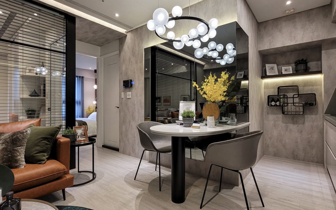 廚房與用餐區,利用圓形檯面設計,讓動線更為流暢,牆壁鑲嵌沈穩灰鏡,營造鏡面折射空間及明亮透視的氛圍。